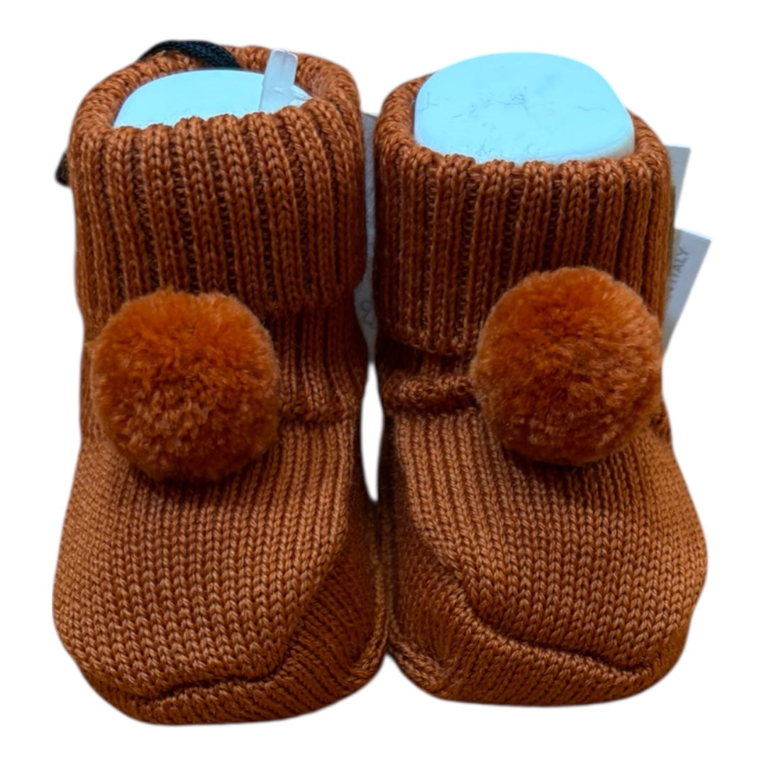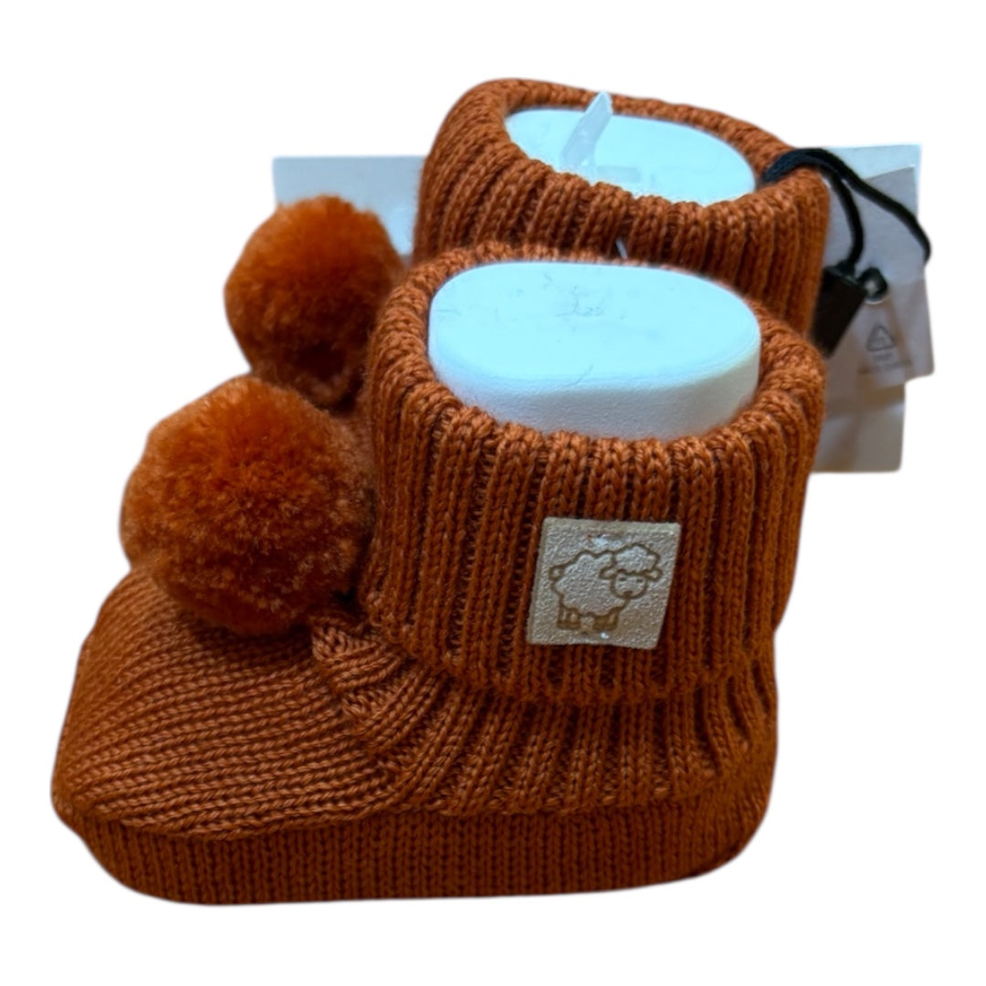 Morbide babbucce in lana merino nel colore ruggine della collezione Maglificio di Verona, ideali per tenere al caldo i piedini del tuo bebè. Garantiscono comfort, traspirabilità e delicatezza sulla pelle sensibile del neonato.Il design dolce e pratico è impreziosito da un soffice pon pon decorativo e dall’etichetta con pecorella ricamata, che aggiunge un tocco tenero e raffinato.