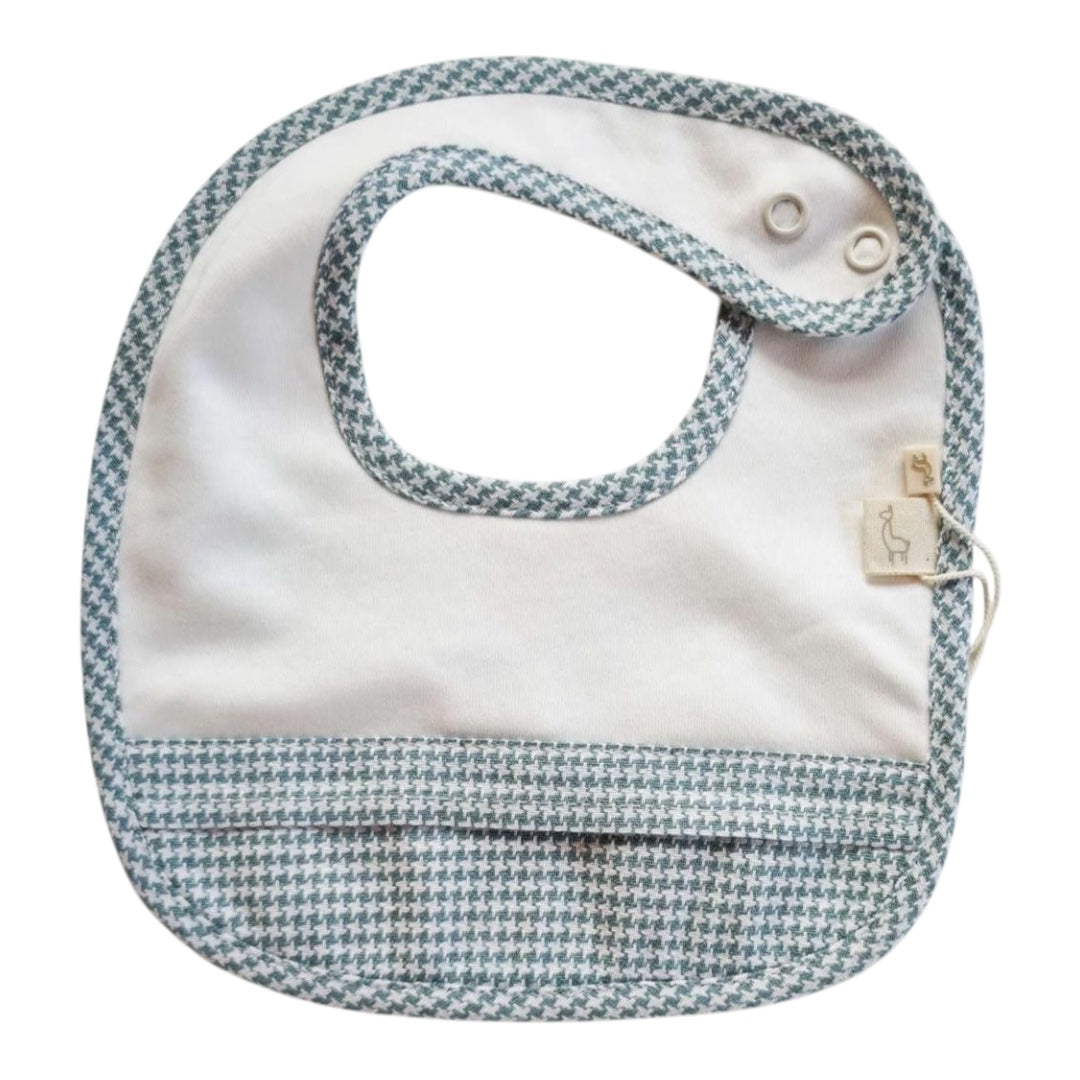 Bavetta della collezione Baby gi bianco in contrasto con fantasia pied de poule verde. La chiusura a scatto di sicurezza garantisce una vestibilità facile e comoda, rendendolo funzionale ed elegante, perfetto per l'uso quotidiano o come regalo.