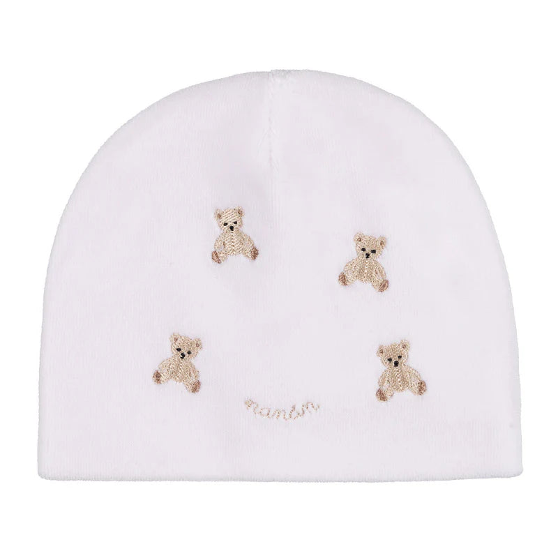 Berretta nascita in ciniglia rifinita dal ricamo di dolci orsetti della collezione Nanan. Questo capo porterà tutto il comfort necessario al bebè.