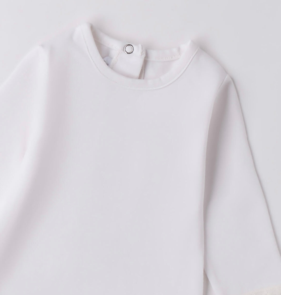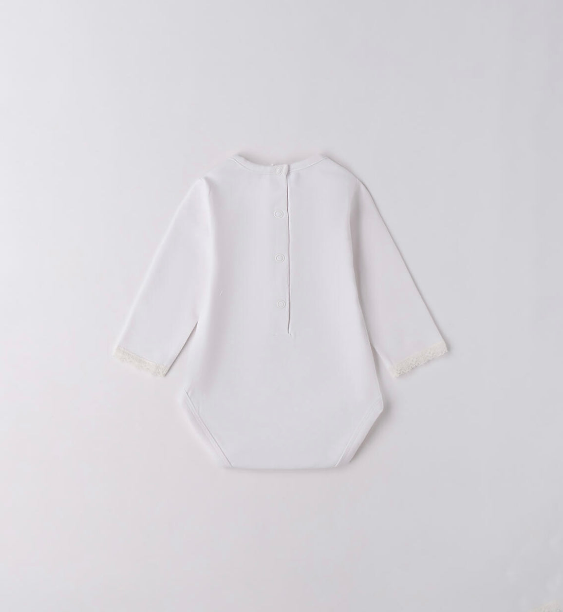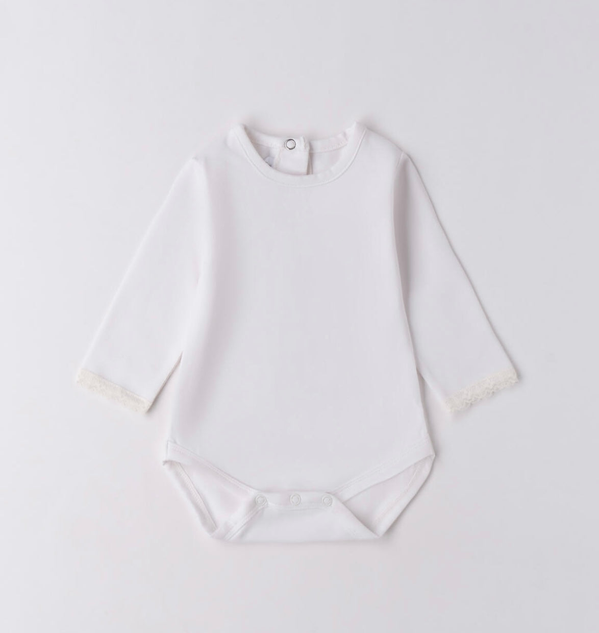Body per neonata Minibanda in jersey stretch di cotone, nel colore panna. Il modello presenta apertura sul retro e nel sottogamba con bottoni a pressione per agevolare il cambio e la vestizione. Il body è in fantasia tinta unita con trina sul fondo manica.