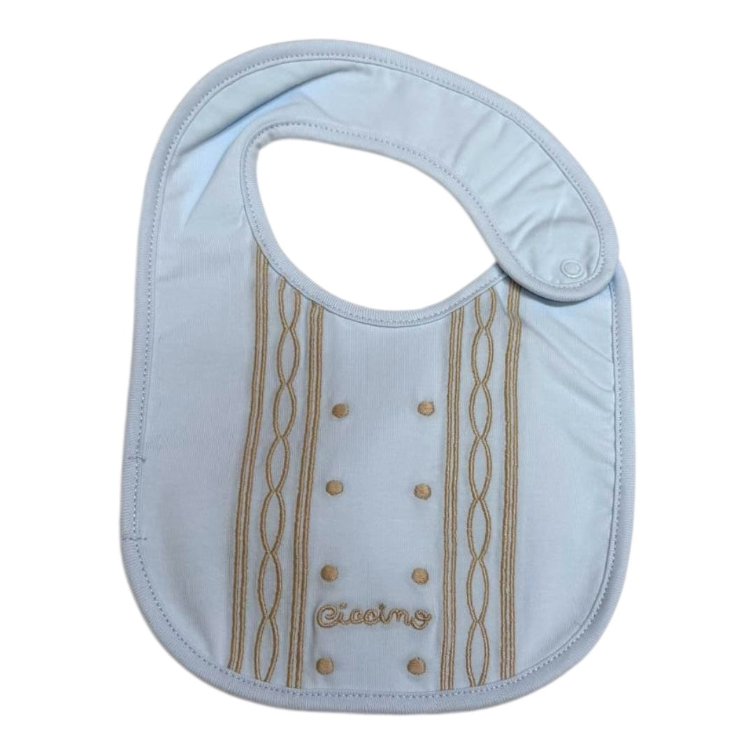 Bavetta della collezione neonato Ciccino , nel colore celeste con ricamo in contrasto. In cotone 100%.