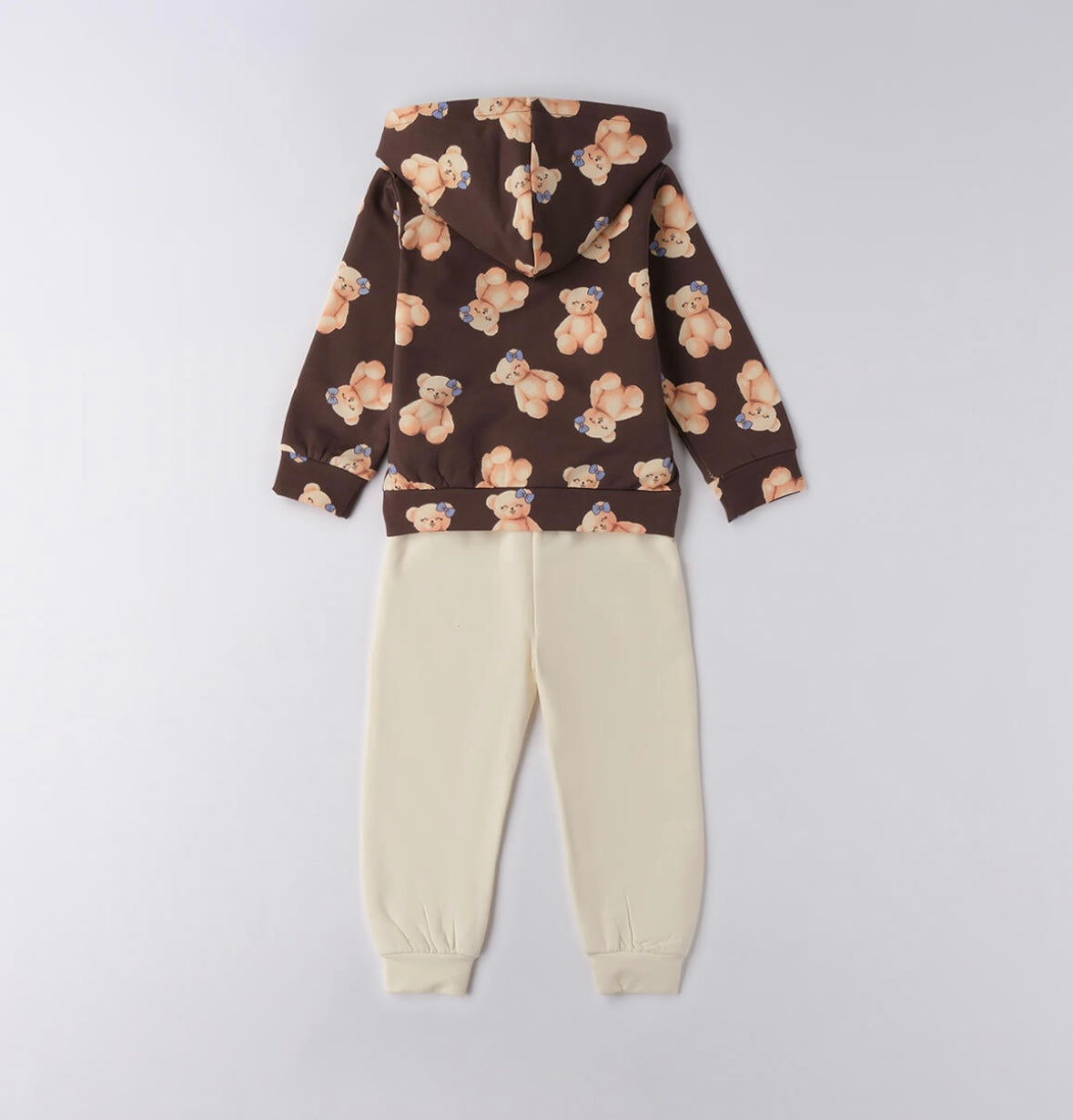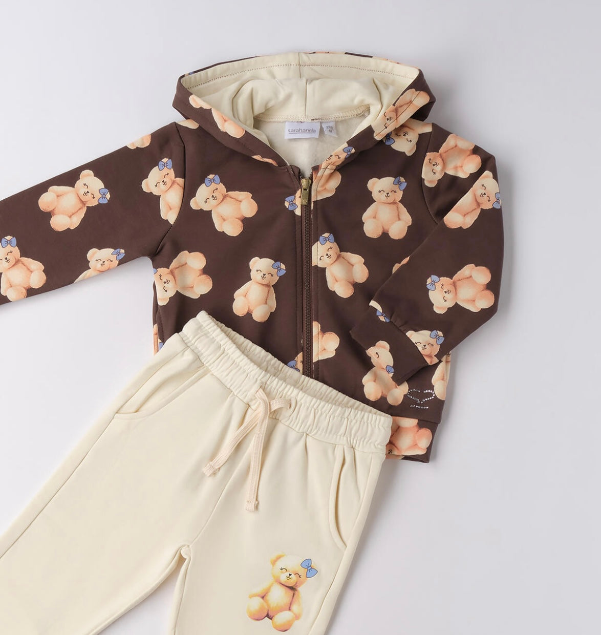 Tuta per bambina Sarabanda realizzata in felpa stretch con leggera garzatura. Felpa con cappuccio e tasche a marsupio. Stampa orsetti. Colore cioccolato-panna.