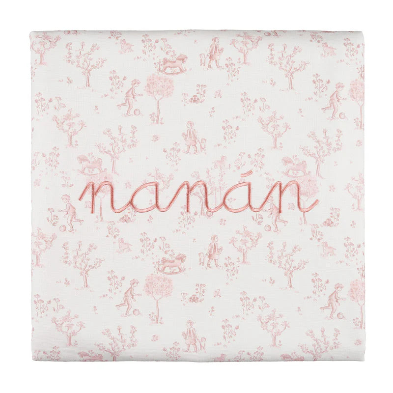 Avvolgi il tuo bebè in una nuvola di dolcezza con questa raffinata coperta della collezione Nanan in morbido cotone, impreziosita da una romantica stampa Toile de Jouy rosa. Perfetta per la culla, la carrozzina o i momenti di coccole, unisce stile classico e comfort, ideale fin dalla nascita.