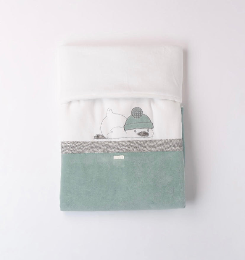 Copertina bicolor per neonato Minibanda in ciniglia con imbottitura in ovatta. Ricamo pinguino. Misure da culla: altezza 100 cm, larghezza 75 cm.