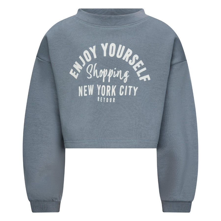 Questa felpa corta grigio chiaro della collezione invernale Retour Jeans è morbidissimo e assolutamente di tendenza! La stampa flock sul davanti con la scritta "Enjoy Yourself Shopping New York City" gli conferisce un look allegro e audace. Perfetto con pantaloni a vita alta o una gonna per un outfit comodo ma alla moda!