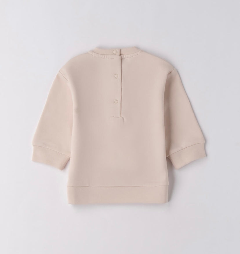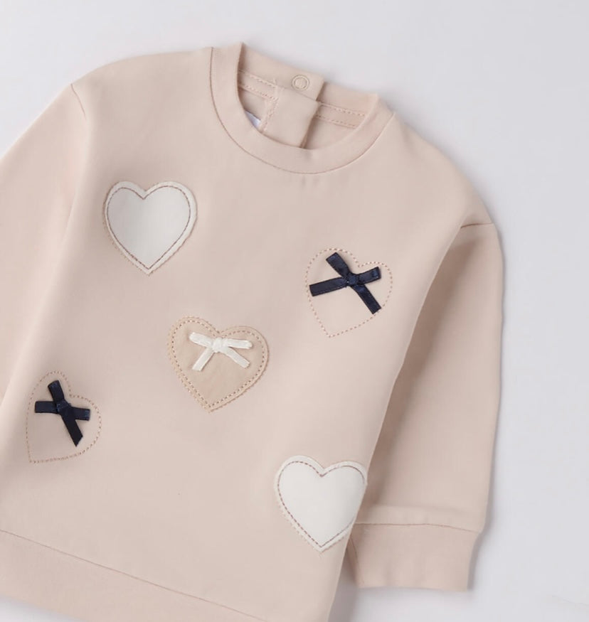 Felpa per bimba Minibanda realizzata in felpa di cotone stretch, pesantezza invernale con felpatura interna. Apertura dietro con bottoni a pressione per agevolare il cambio e la vestizione. La felpa è arricchita da fiocchi e applicazioni ricamo.
