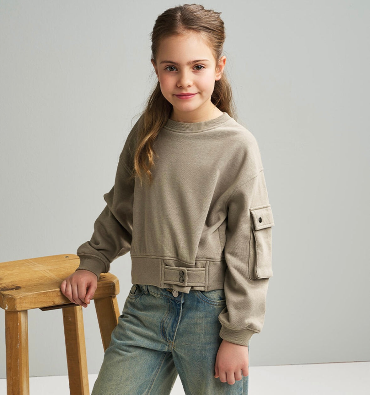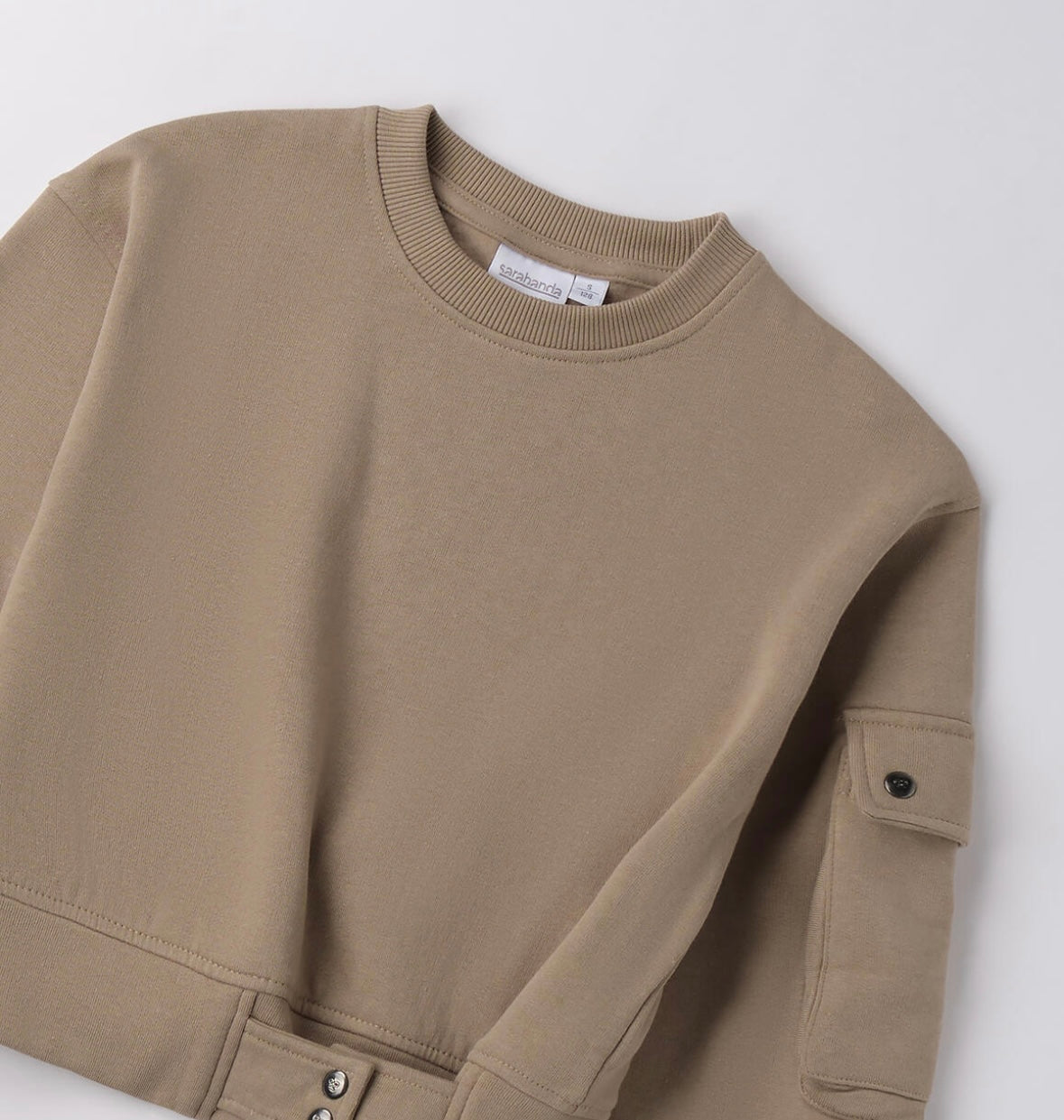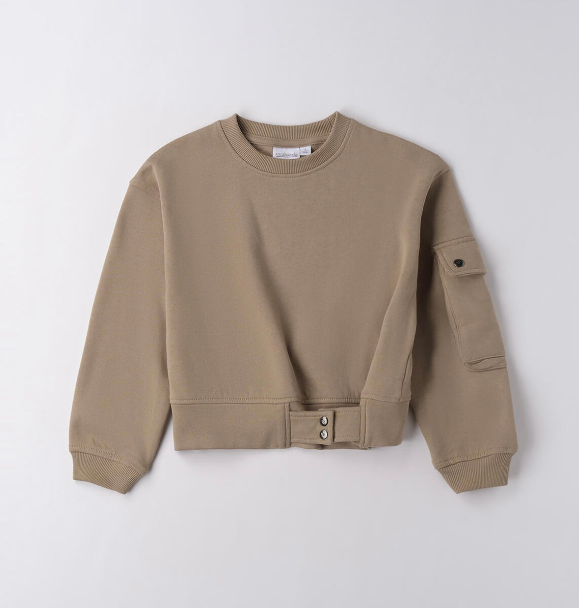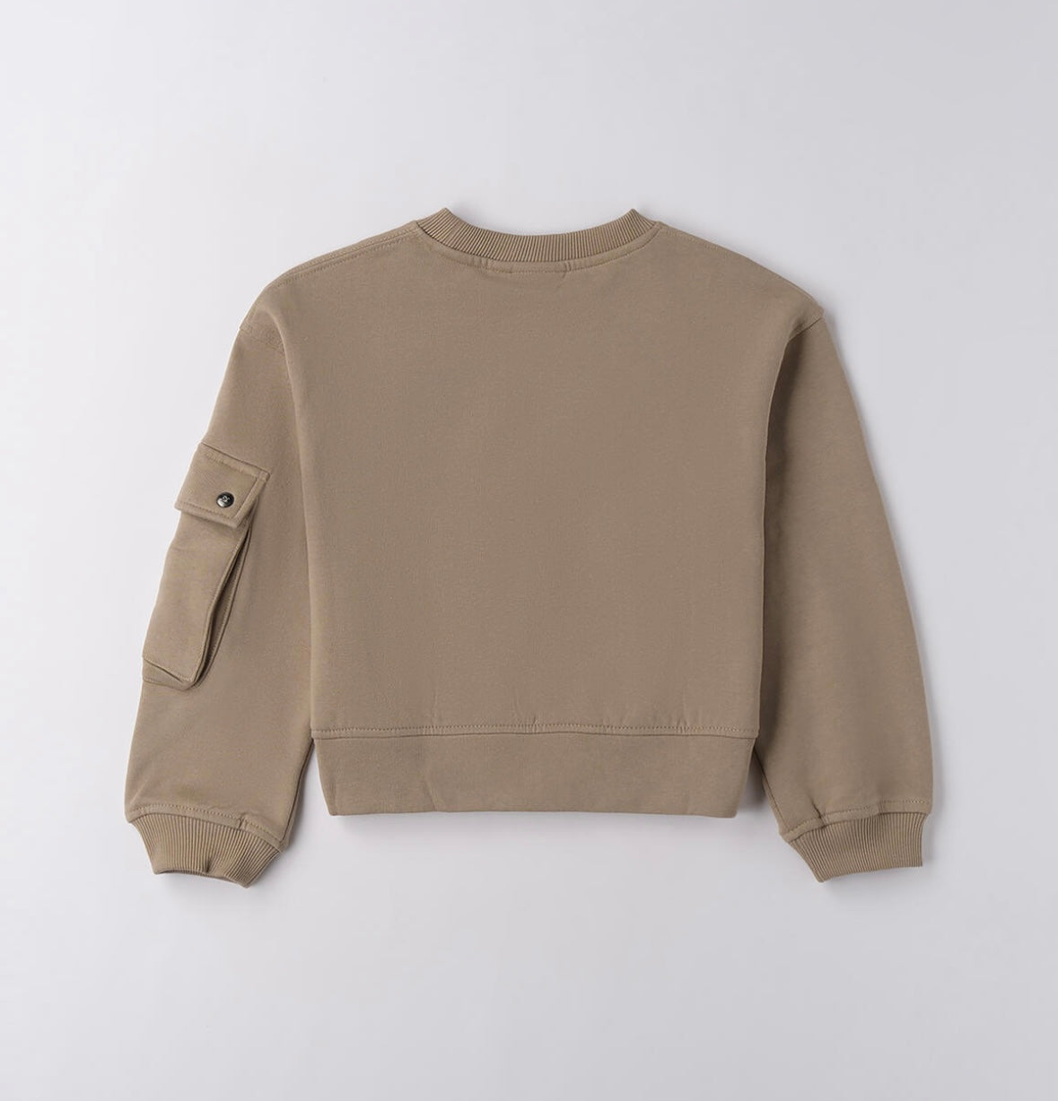 Felpa da ragazza Sarabanda realizzata in tessuto invernale felpato. Modello girocollo con tasca sulla manica.