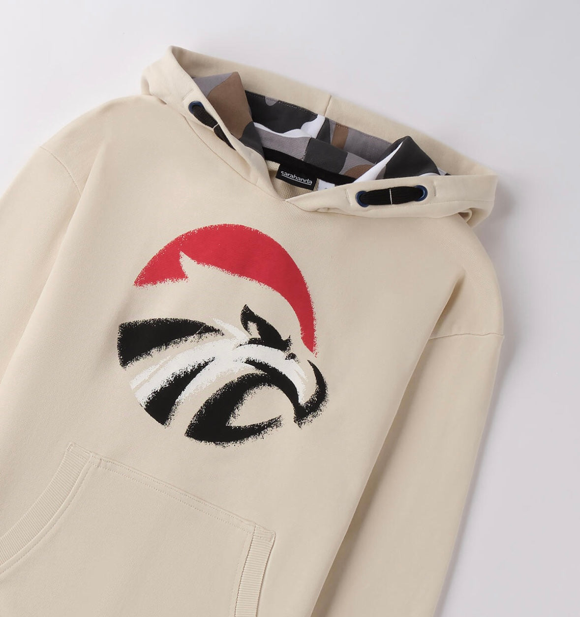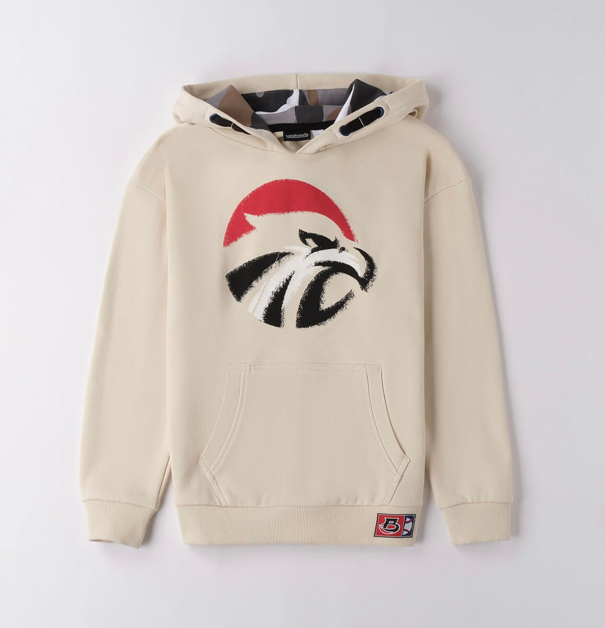 Felpa ragazzo Sarabanda realizzata in tessuto non felpato 100% cotone. Modello con cappuccio foderato in fantasia camouflage. Tasca a marsupio e stampa davanti. Vestibilità over.
