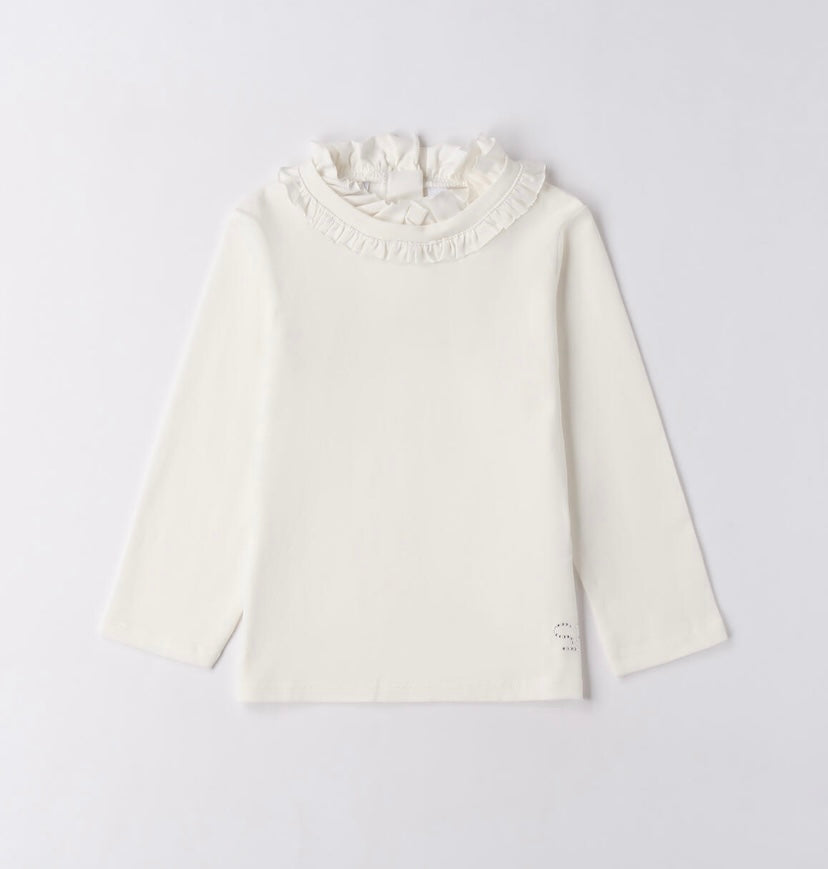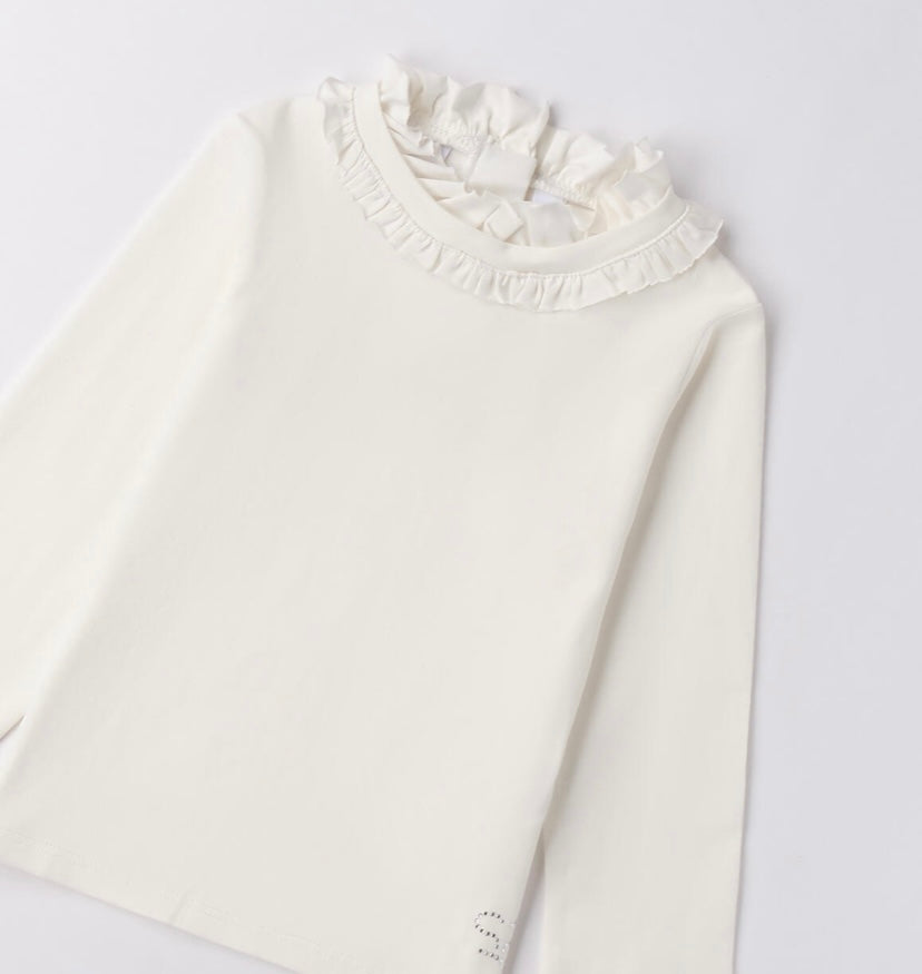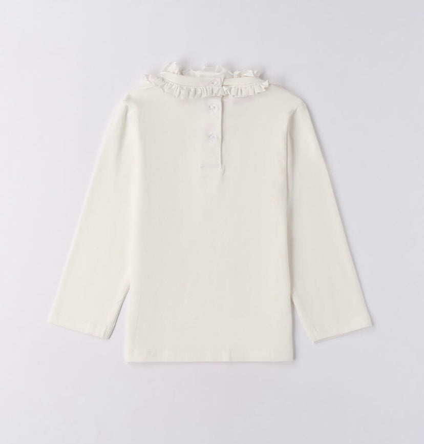 Lupetto avvitato per bambina Sarabanda realizzato in jersey stretch manopesca con ruches sul colletto e apertura dietro con bottoni.