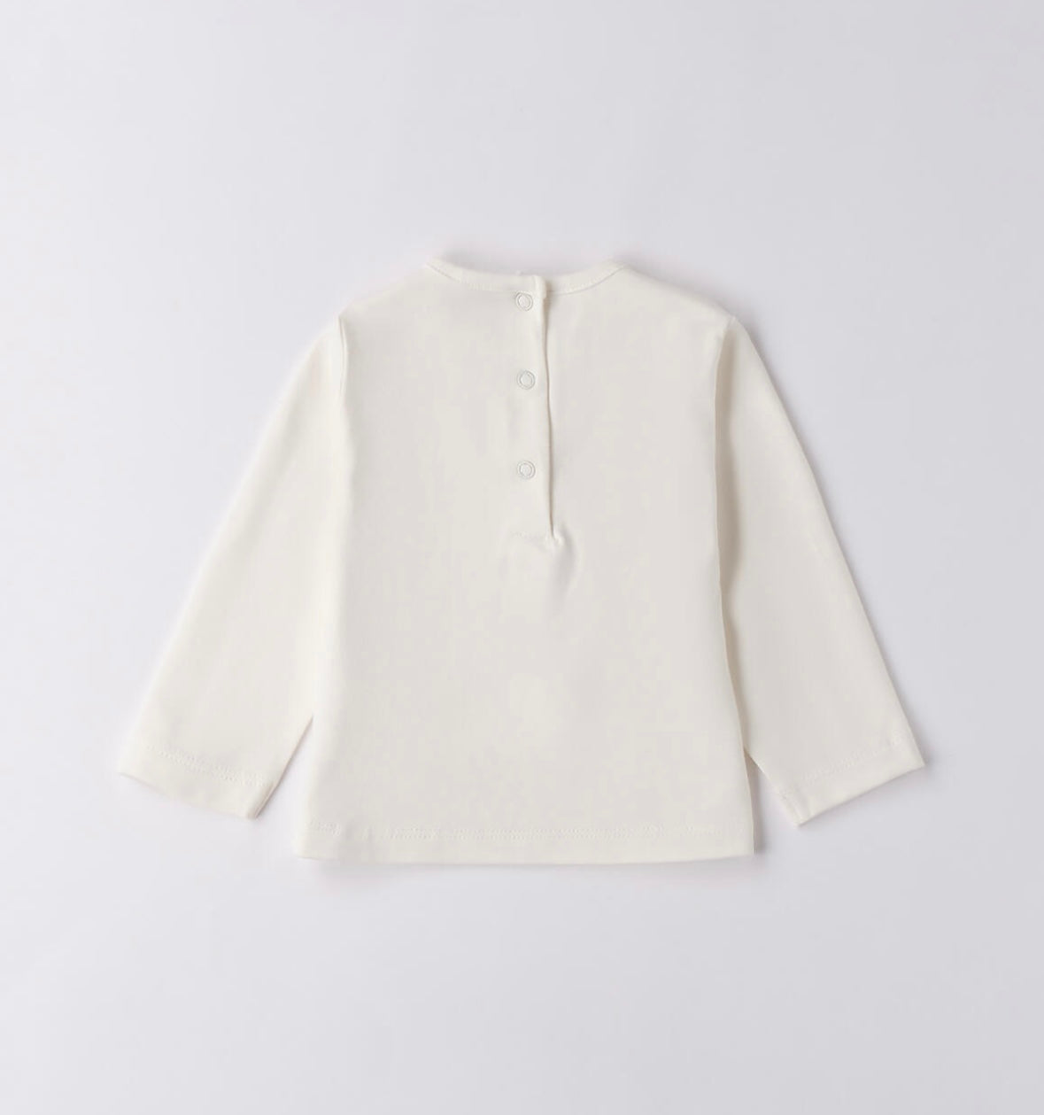 Maglietta per bimba Minibanda realizzata in jersey stretch di cotone manopesca. Il modello presenta apertura sul retro con bottoni a pressione per agevolare il cambio e la vestizione. L'articolo è arricchito da cuore in chiffon.