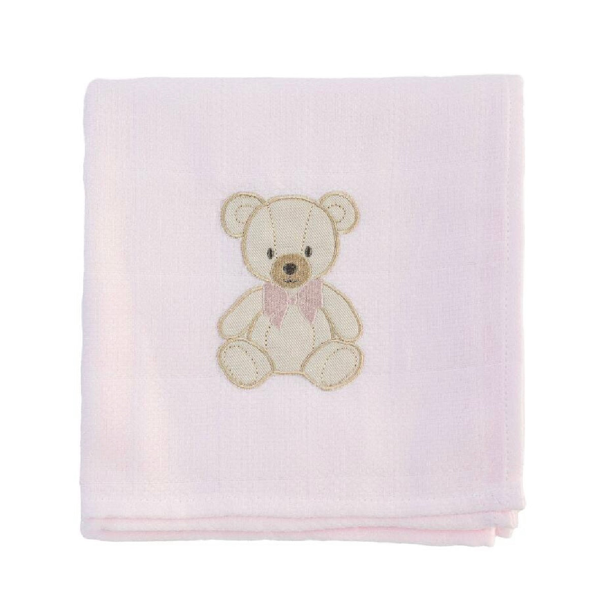 Mussola di cotone rosa della collezione Baby gi , con ricamo orso. Il cotone morbido è adatto per stare a contatto con la pelle del neonato.