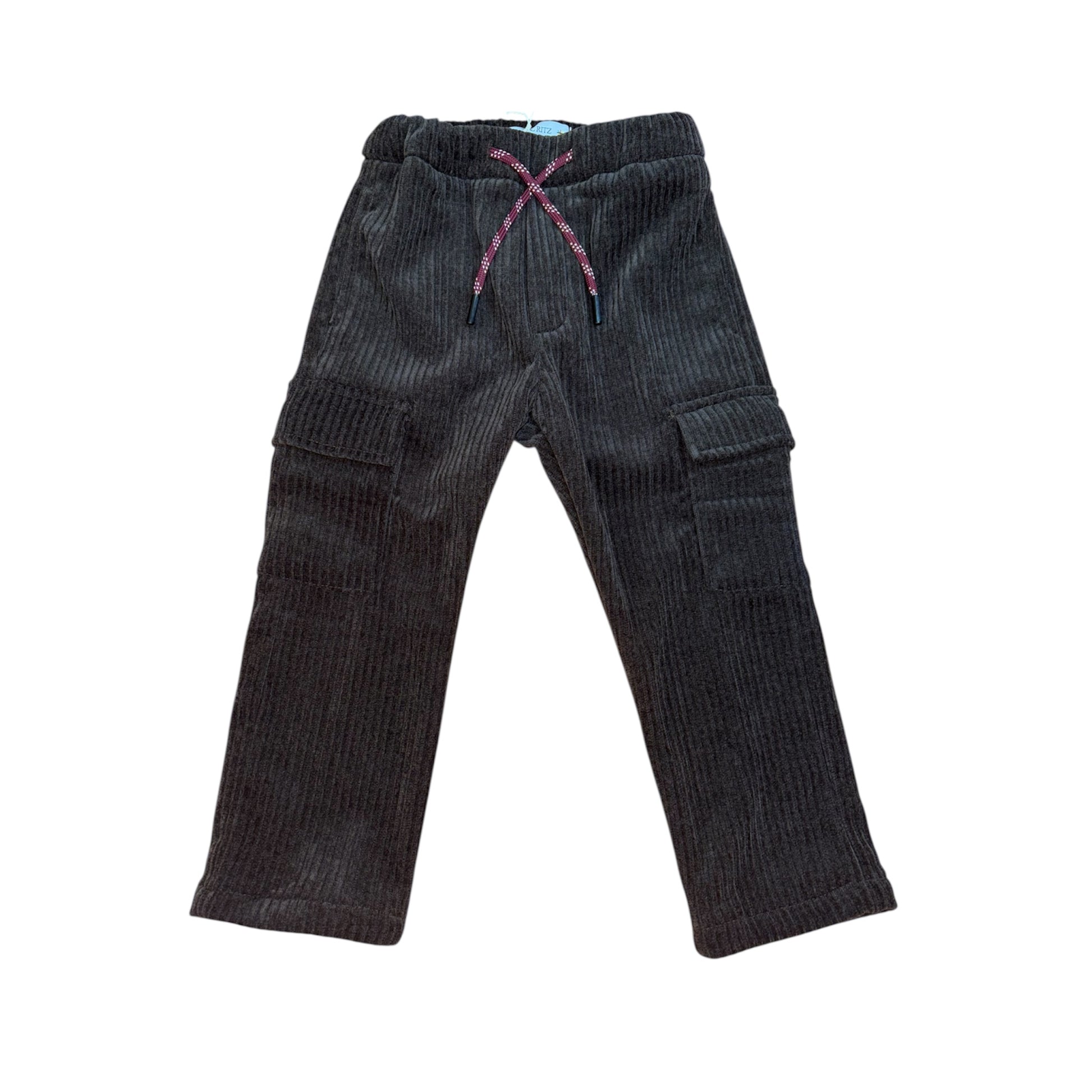 Pantalone cargo in velluto mille righe marrone, tasche laterali , vita regolabile con coulisse lacci di colore a contrasto.
