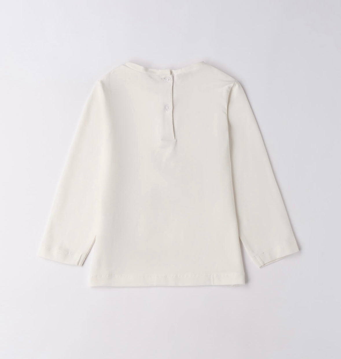 Maglietta bambina Sarabanda realizzata in jersey stretch di cotone, manopesca, con strass e stampa orso. Colore panna.