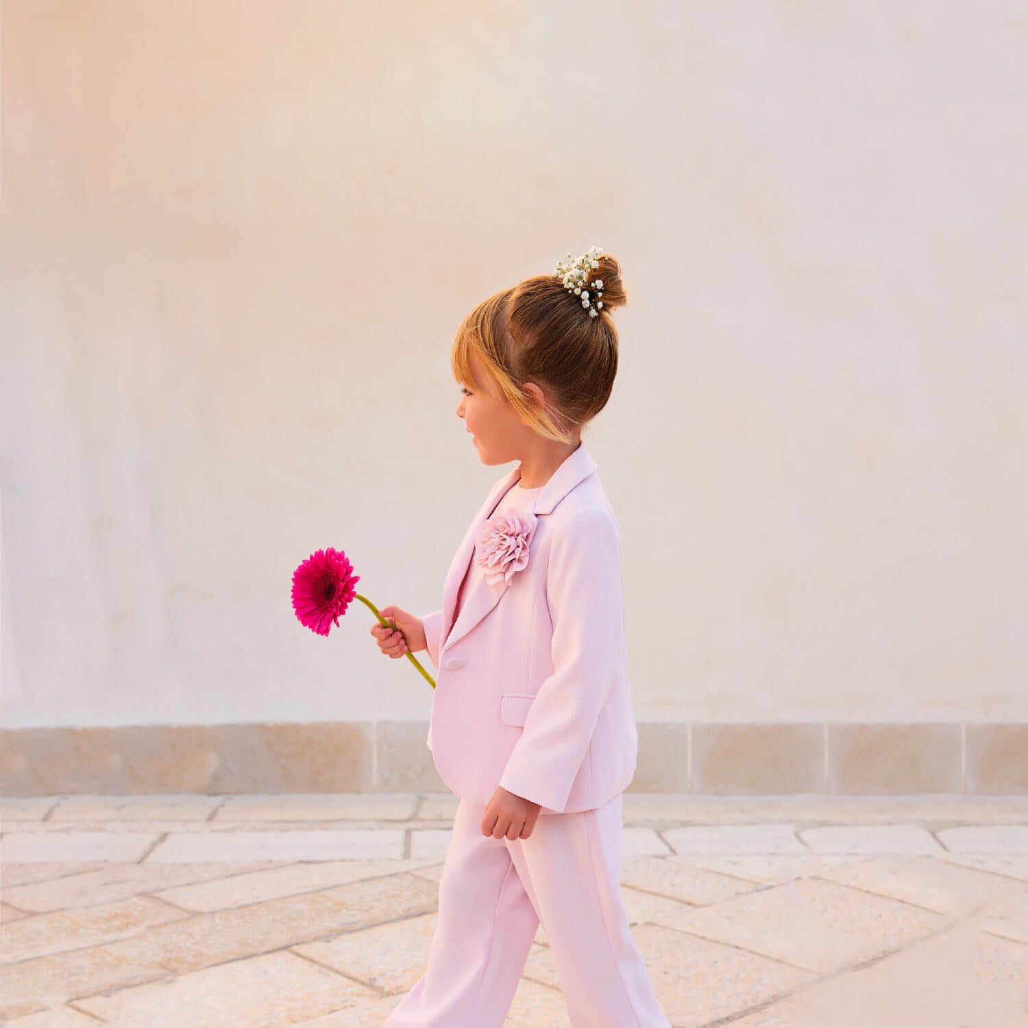 Tailleur bambina in tessuto crepe della collezione PE Sarabanda, composto da giacca che presenta apertura frontale con bottoni,fiore in applicazione e tasche laterali, il modello del pantalone è con gamba ampia.
