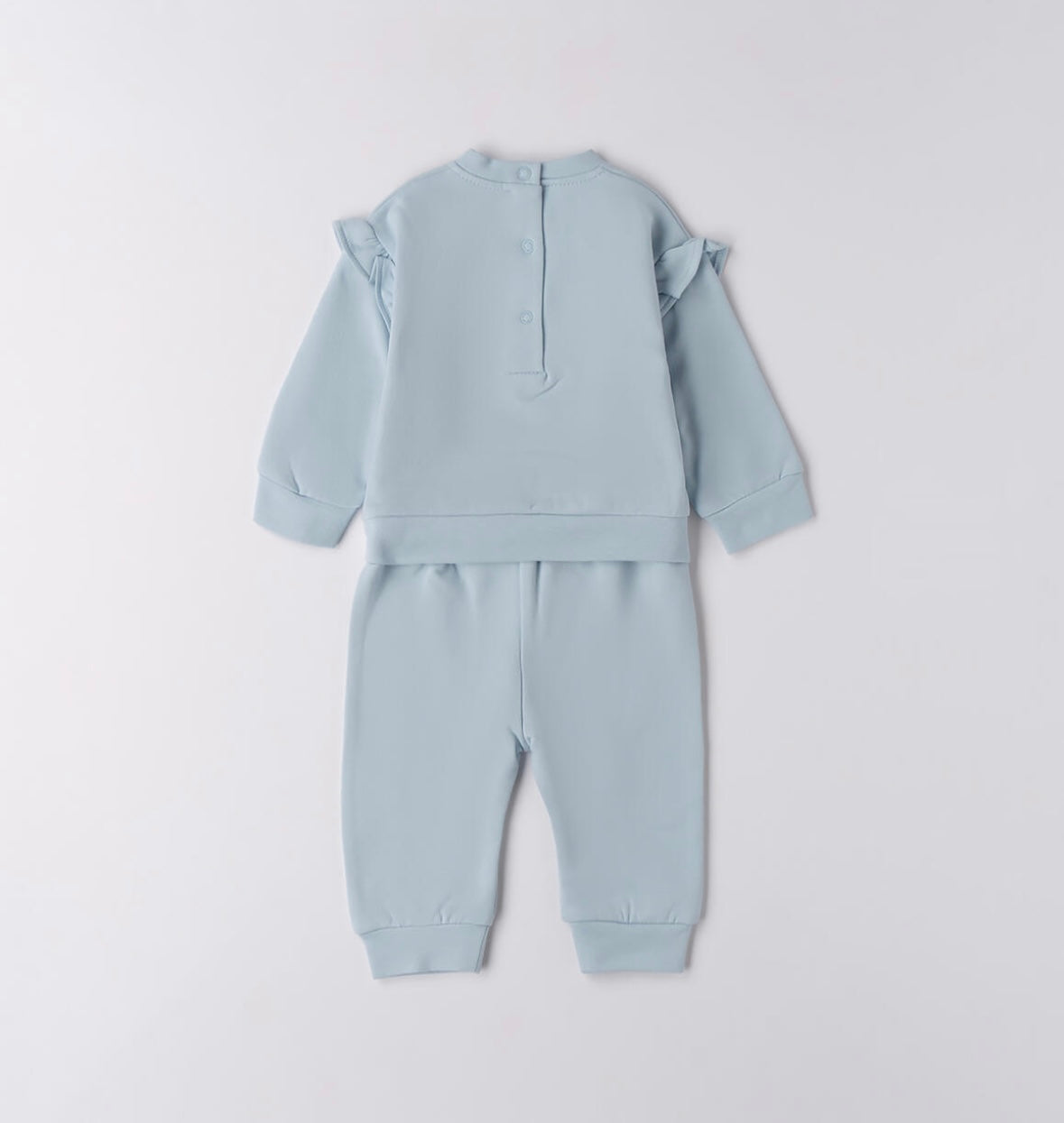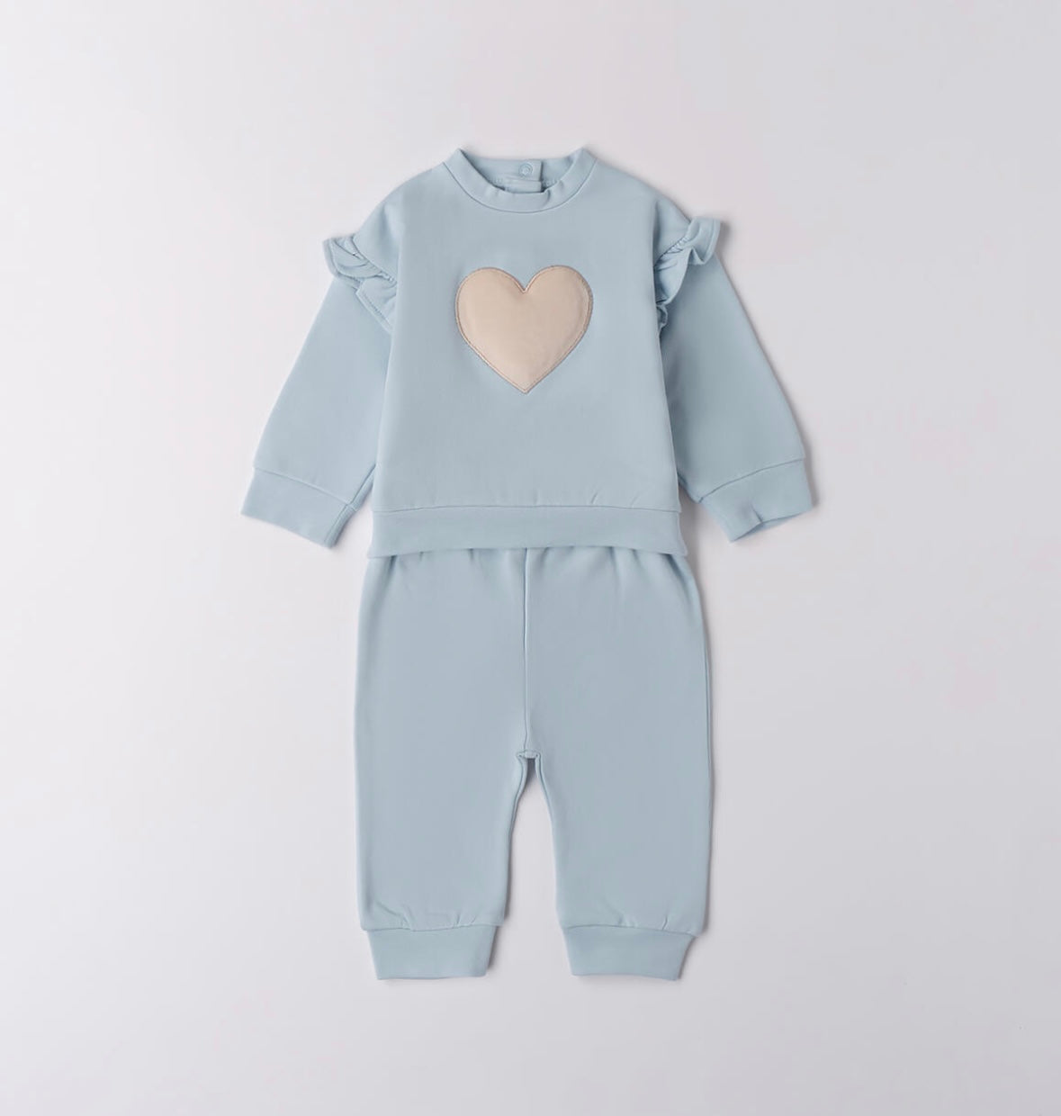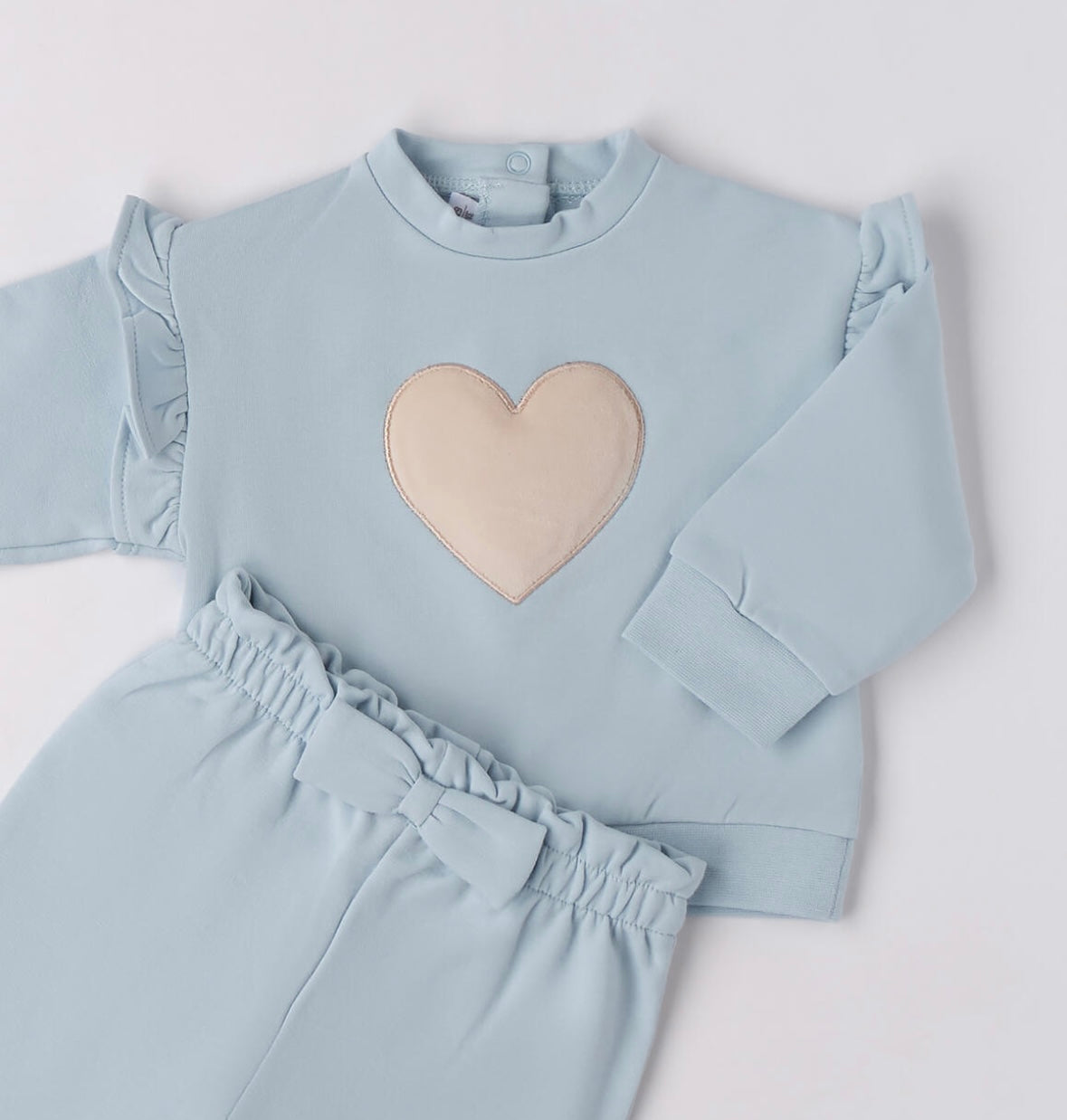 Tuta per neonata Minibanda in felpa stretch di cotone invernale, felpata internamente. La felpina ha l'apertura dietro con bottoni a pressione, rusches sulle maniche e cuore davanti. Pantalone con vita arricciata e fiocco.