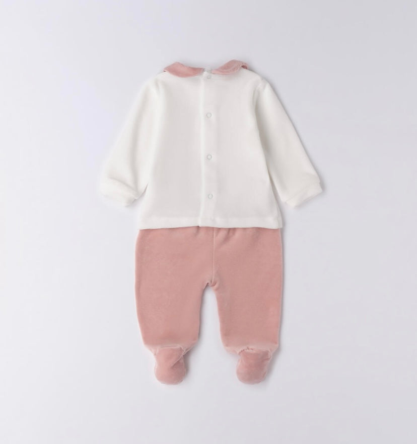 Tutina per bimba neonata Minibanda realizzata in ciniglia effetto velluto con ricamo e fiocchi in applicazione. Il modello presenta apertura sul retro per agevolare il cambio e la vestizione.