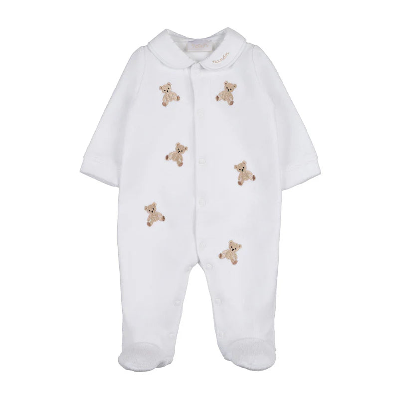 Tutina in ciniglia con colletto tondo e piping della collezione Nanan.Il capo è impreziosito dal ricamo di dolci orsetti. Apertura frontale con bottoni a pressione.