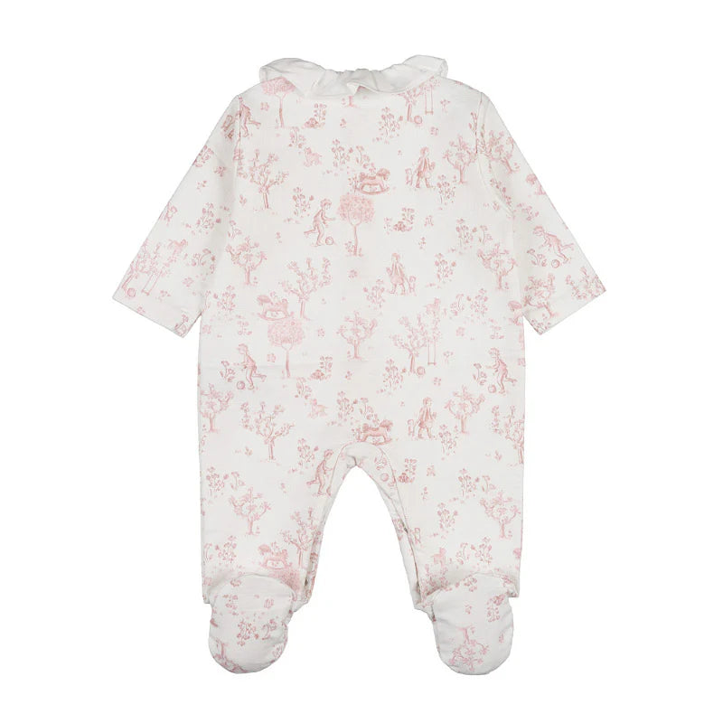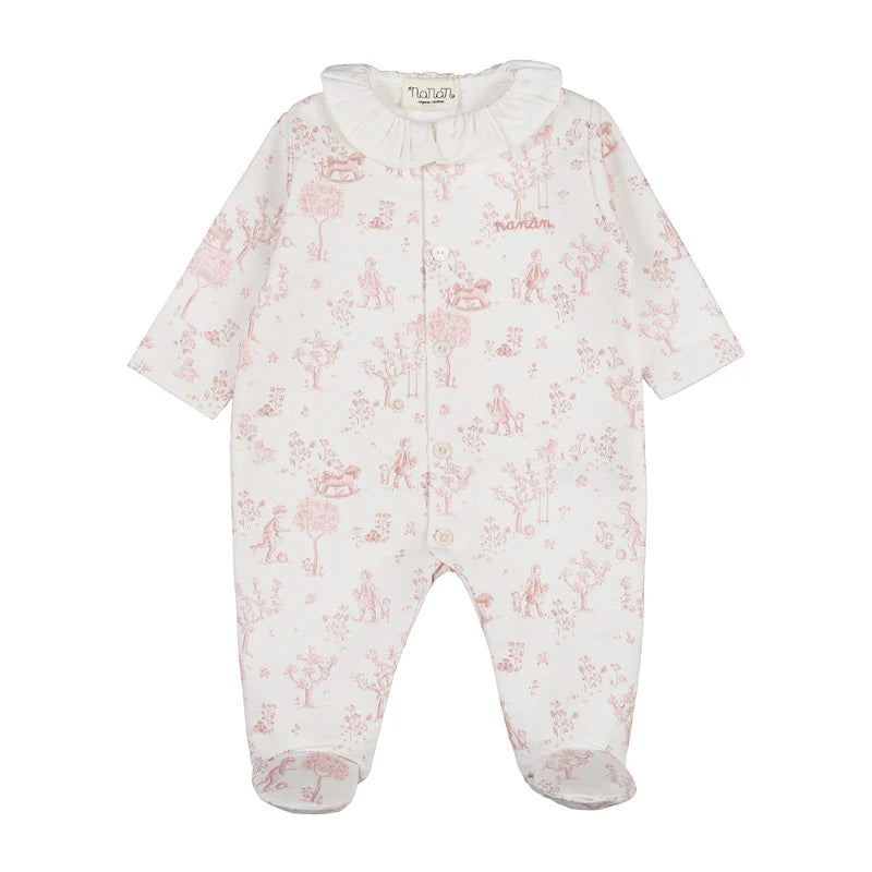 Questa raffinata tutina della collezione Nanan è l’incontro perfetto tra comfort e stile senza tempo. Realizzata in morbido cotone e impreziosita da una delicata stampa toile de Jouy rosa, presenta un’apertura frontale pratica e un colletto classico che dona un tocco di eleganza romantica.