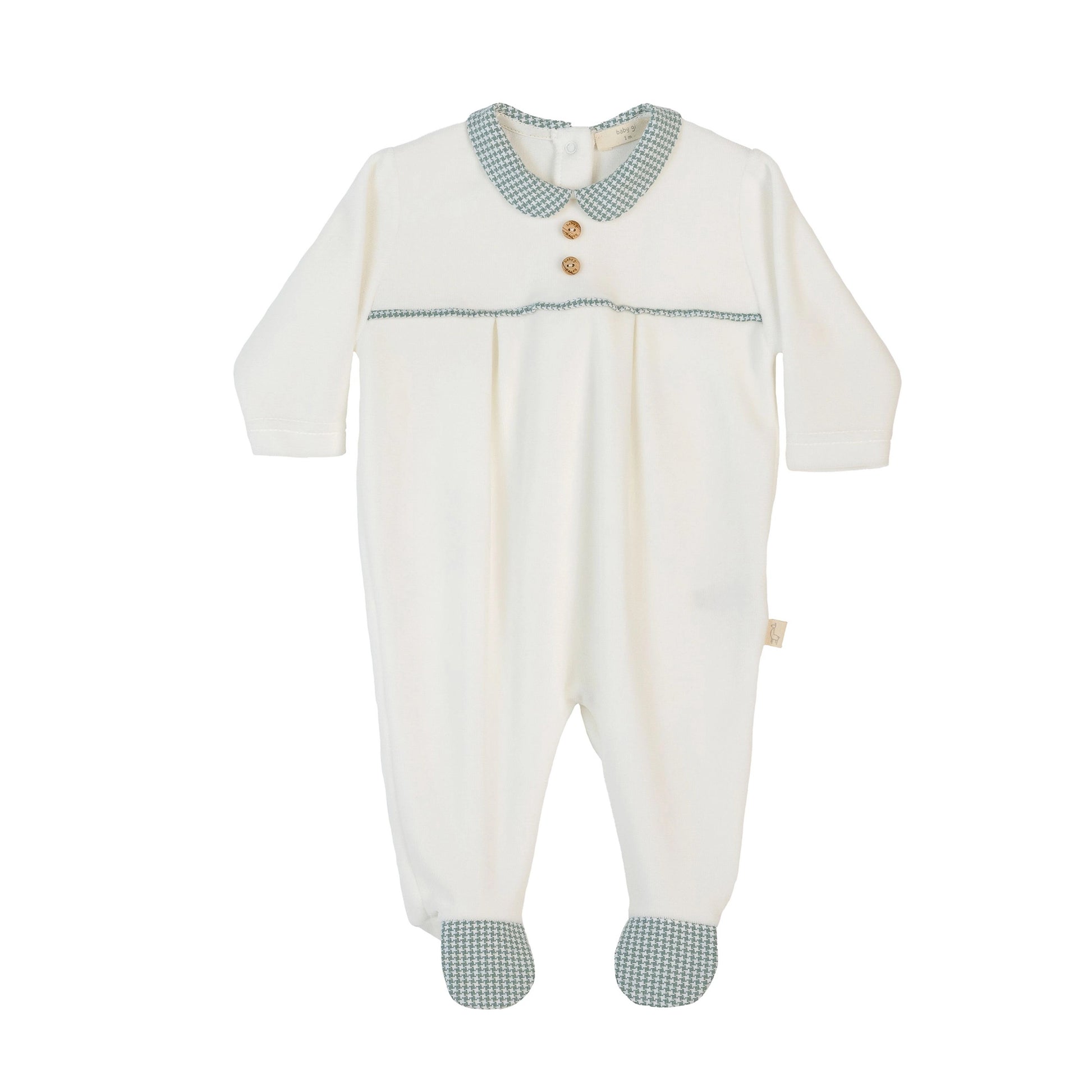 Tutina in ciniglia della collezione neonato Baby gi , bianca con colletto in contesto fantasia pied de poule verde. Presenta due bottoni da ornamento sotto al colletto, apertura dietro con bottoni a pressione.