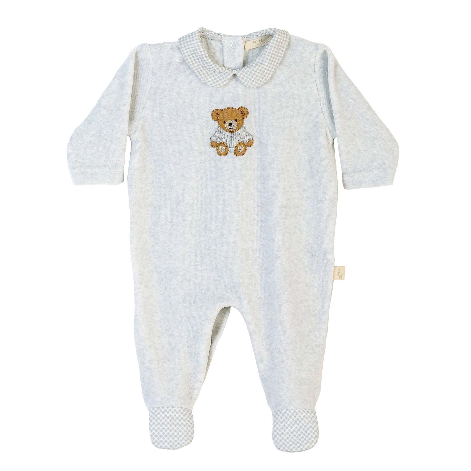 Tutina in ciniglia nel colore grigio della collezione Baby gi. Disegno di un simpatico orsetto sul davanti e apertura sulla parte posteriore con bottoni a pressione.