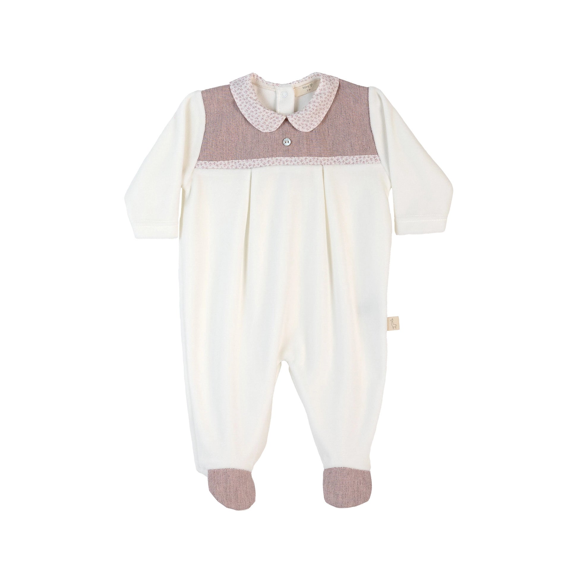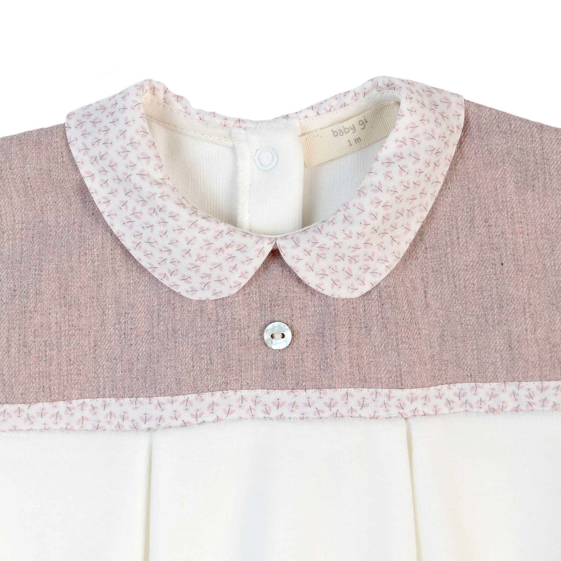Tutina con colletto fantasia della collezione Baby gi , in ciniglia bianca e rosa. Apertura dietro con bottoni a pressione.